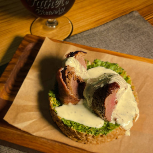 філе яловичини, крупа перлова, вершки, бекон, пармезан, шпинат, соєвий соус, соус Блю Чіз