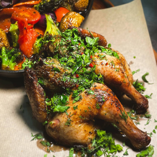 півник Кокюле в травах запечений з зеленим маслом, помідори чері, броколі, цибуля, морква, печериці, соус