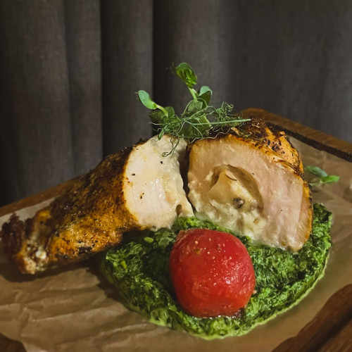 філе курки, сир Брі, білі гриби, подушка зі шпинату, помідори Чері