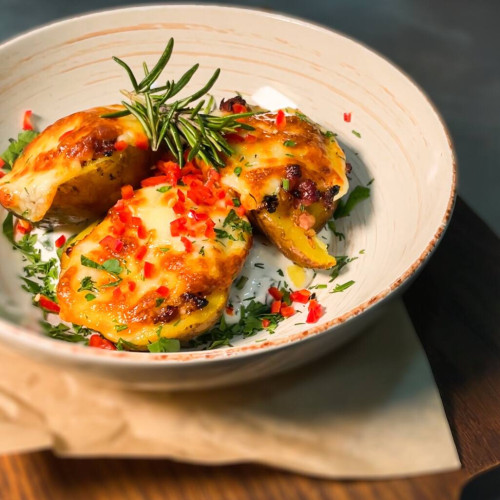 запечена картопля в лушпинні з беконом та пармезаном, сметанним соусом з часником та зеленню
