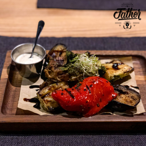 помідор, перець болгарський, цукіні або кабачок, баклажан, гриб глива, соус Тартар