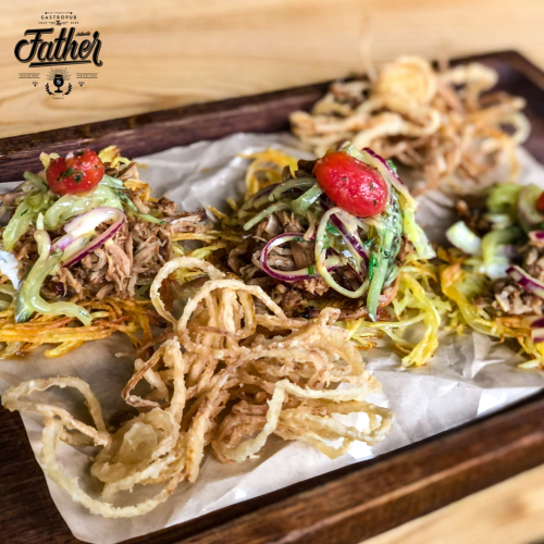 томленна свинина в спеціях на хрусткому картопляному «пляцку», під соусом цацикі