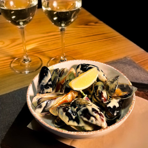 чорноморська мідія, біле вино, стебло селери, тим’ян, розмарин, вершки, лимон